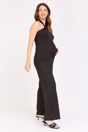 אוברול הריון שיקי ואלגנטי בגזרת קולר הנקשר מאחור, בשילוב עם תכשיט זהב שמוסיף נגיעה של דרמה ואלגנטיות.