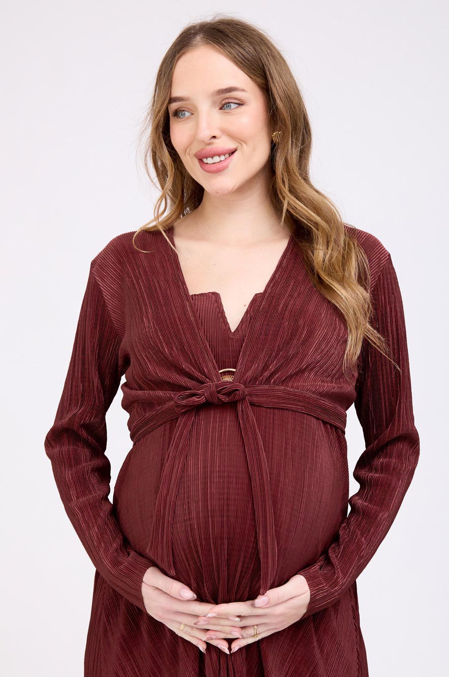 עליונית בולרו להריון בגזרה קצרה מעל קו המותניים עם שרוולים ארוכים, מבד פליסה בטקסטורת כפלים עדינה ורצועות קשירה להתאמה אישית. פריט משלים וורסטילי שמוסיף סטייל וכיסוי לכל שמלה או חולצה אלגנטית.