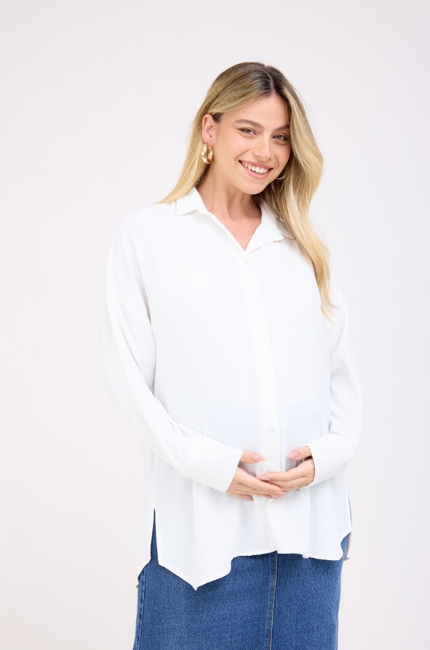 חולצת הריון מבד נשפך בגזרה מחוייטת ורכה עם כפתורים לכל אורכה, צווארון גברי, שרוולים ארוכים בעלי מנג'ט ארוך.