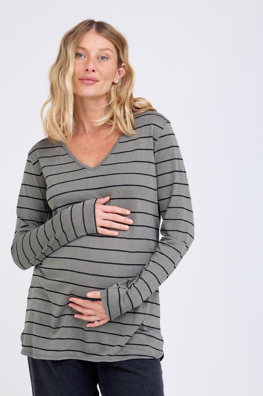 חולצת הריון רכה מבד נעים, בהדפס פסים על זמני בגזרה רפויה ומשוחררת ומחשוף V.