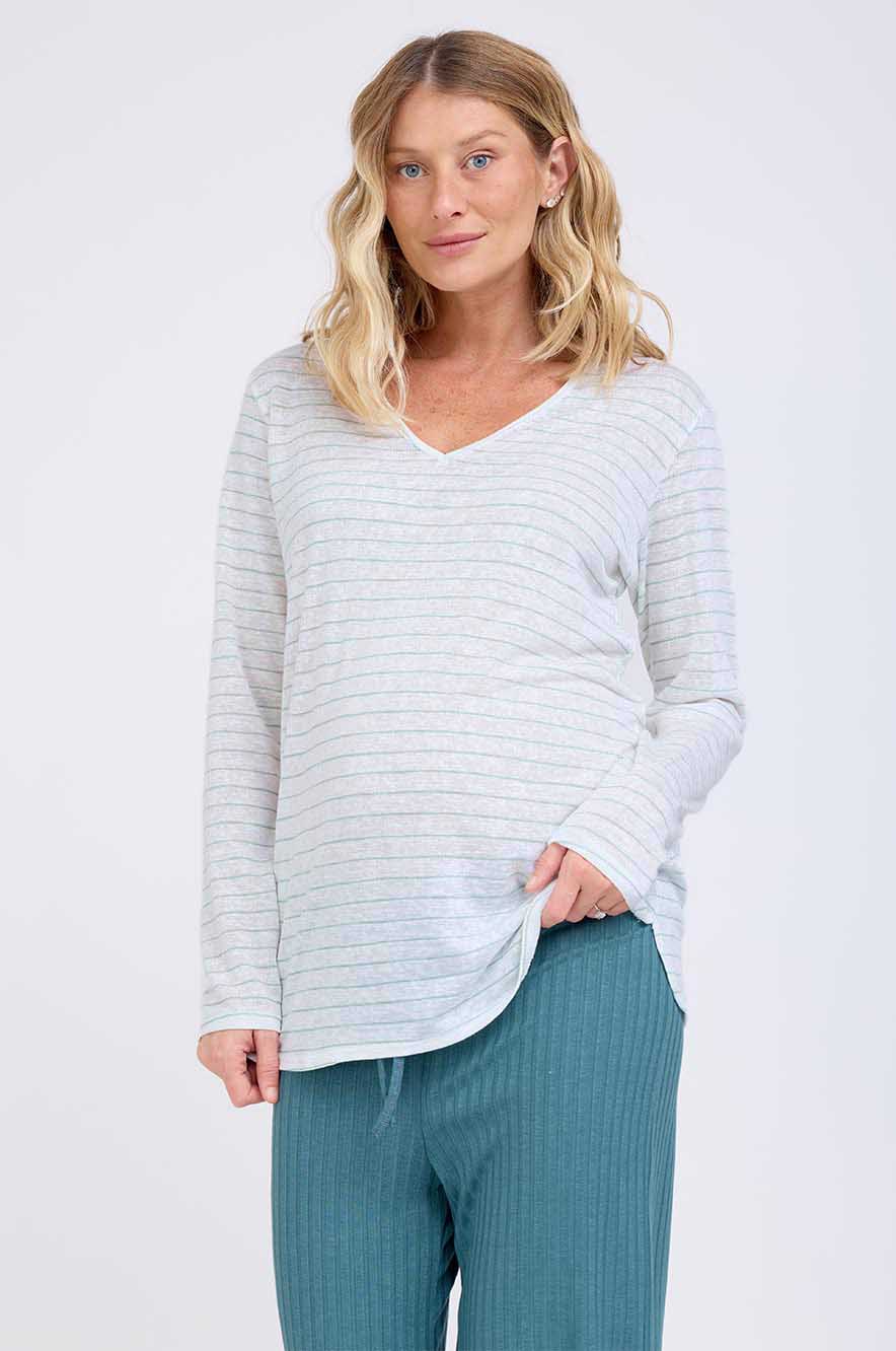 חולצת הריון רכה מבד נעים, בהדפס פסים על זמני בגזרה רפויה ומשוחררת ומחשוף V. חולצה קלאסית להעביר איתה את הימים הנעימים והקרירים של עונת המעבר, מומלץ לשלב עם מכנסי ג'ינס וסניקרס למראה יום יומי או מכנסים שחורים ונעלי בלרינה למראה אלגנטי.