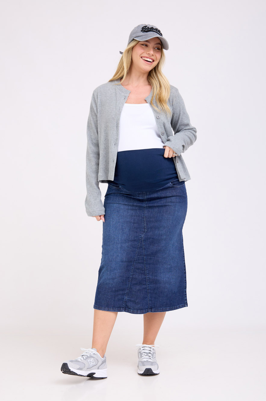 חצאית ג’ינס להריון קלאסית באורך מידי, בגזרת A מתרחבת, עם 4 כיסים ורצועת בד נמתחת בשילוב עם משולש ג’ינס תפירה קדמי ואחורי המאפשר מתיחה מרבית וחופש תנועה. חצאית מושלמת ונוחה שתלווה אותך לאורך כל חודשי ההיריון ואחריו.