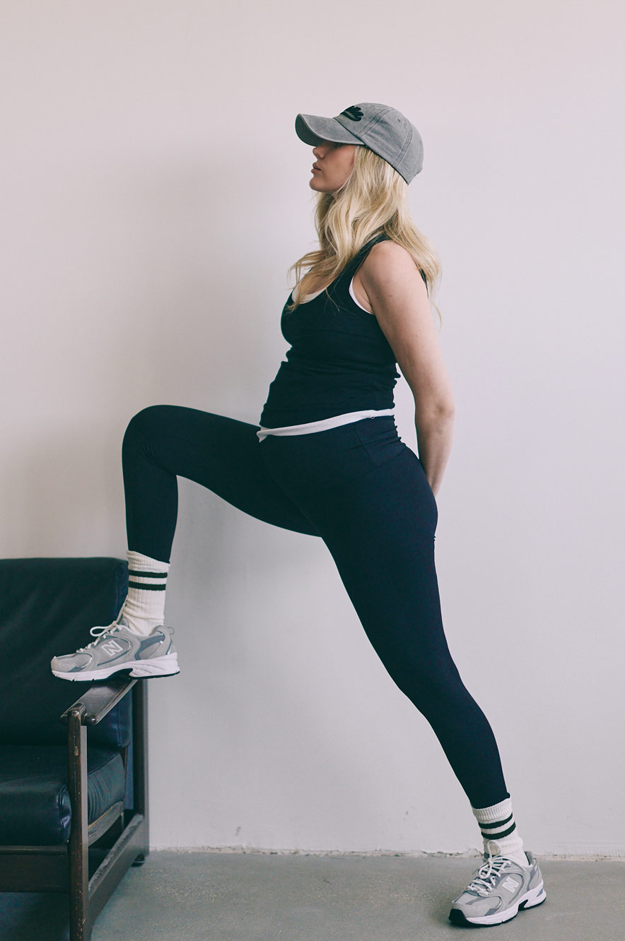 טייץ הריון ארוך עם כיווץ בחגורה בחלק התחתון מאחור, גמיש ונוח, המדגיש את הסילואטה ומלווה את הבטן ההריונית. מקסימום נוחות לכל ספורט שתבחרי לעשות בהריון פריט ורסטילי שמשדרג לוק ספורטיבי–שיק או יום יום קליל ונוח.