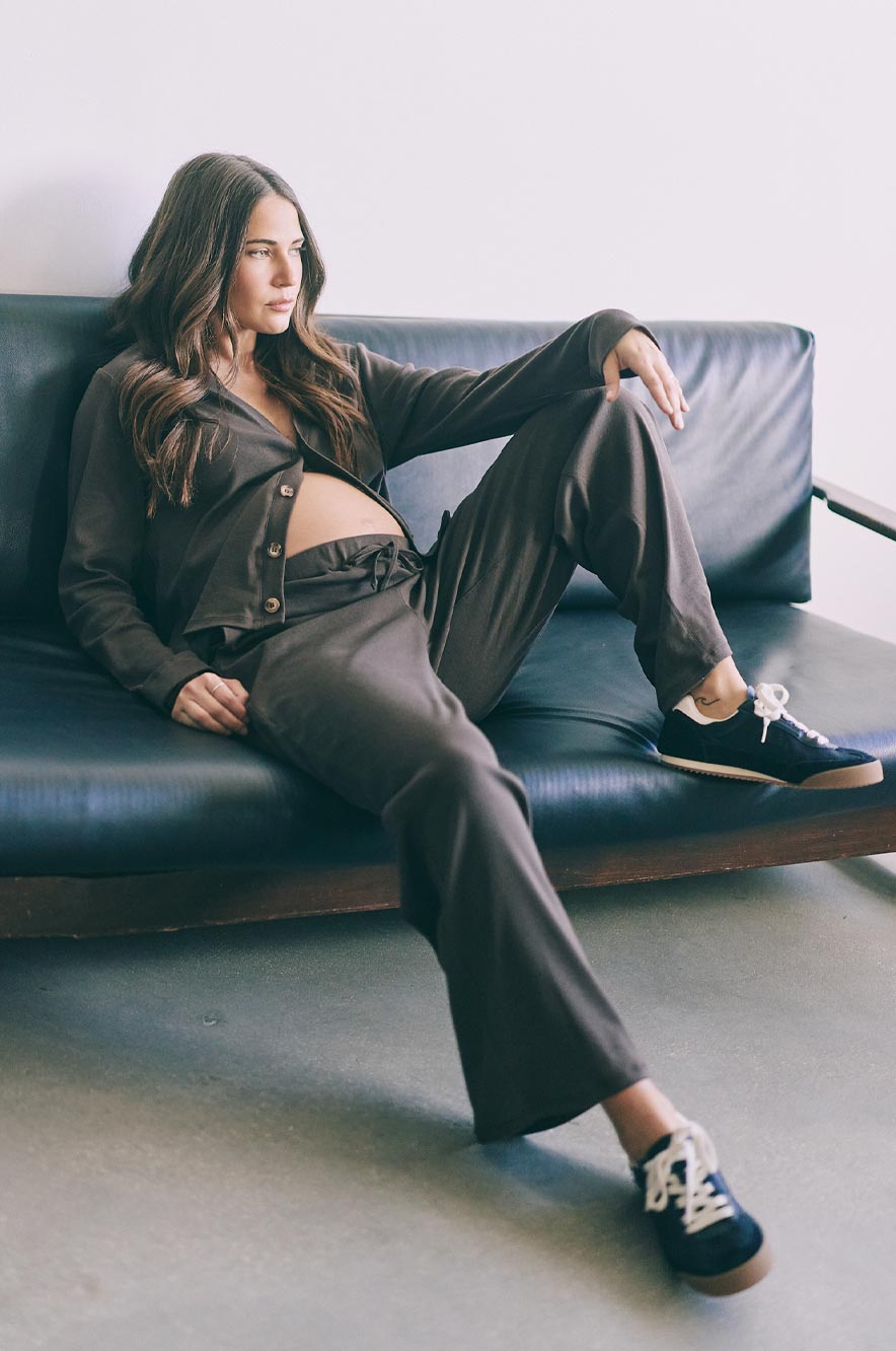 מכנסי הריון בגזרה משוחררת וגבוהה, מבד כותנה רך ונעים עם חגורת גומי ושרוך קשירה להתאמה מושלמת לכל שלבי ההריון. מומלץ לשלב עם קרדיגן תואם ליצירת מראה מלא בסטייל.