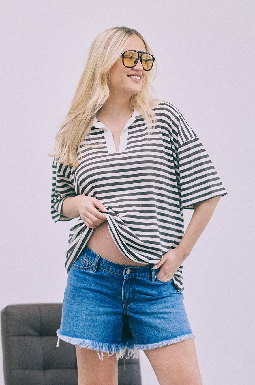ג'ינס קצר להריון בגזרה ישרה ומותן נמוכה, עם 5 כיסים וקצוות פרומים בסיומת הג'ינס לטאצ' מיוחד וקול.