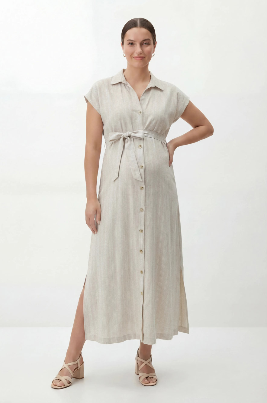 שמלת הריון בגזרה משוחררת ואוורירית באורך מידי עשויה מבד דמוי פשטן. בעלת חגורה קשירה מעל הבטן וכפתורים לכל האורך, שרוולים קצרים ושסעים בתחתית השמלה שמוסיפים קלילות ותנועה.