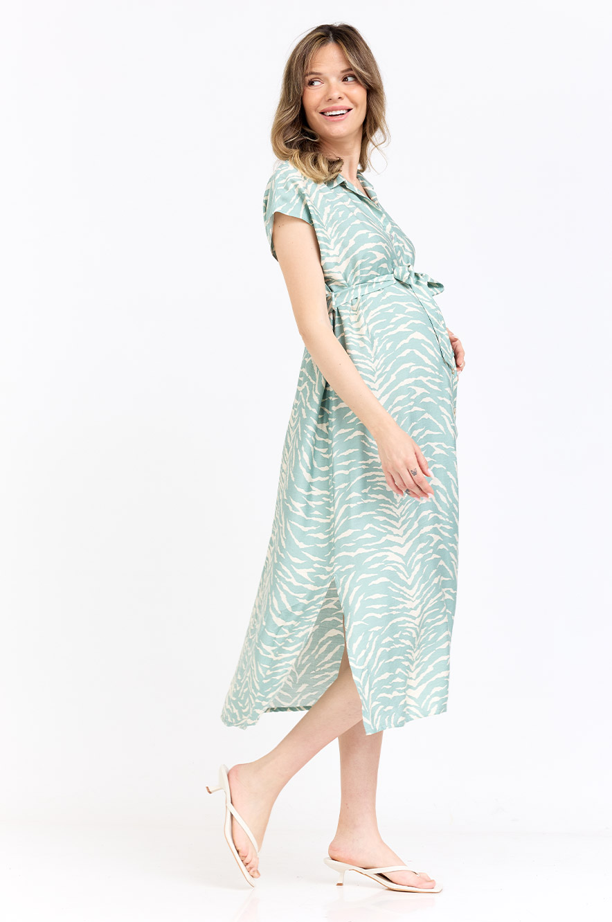 שמלת הריון בגזרה משוחררת ואוורירית באורך מידי עשויה מבד דמוי פשטן. בעלת חגורה קשירה מעל הבטן וכפתורים לכל האורך, שרוולים קצרים ושסעים בתחתית השמלה שמוסיפים קלילות ותנועה.