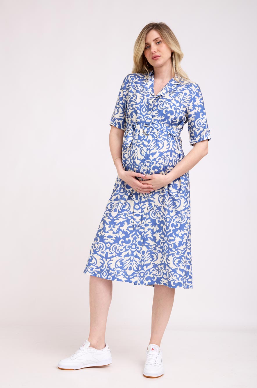 שמלת הריון באורך מידי, שרוולים עד המרפק עם סגירת כפתור מבד רך, עם חגורה לקשירה מעל הבטן וכפתורים לכל האורך, סטייל מושלם לתקופת ההריון וגם לאחריו.