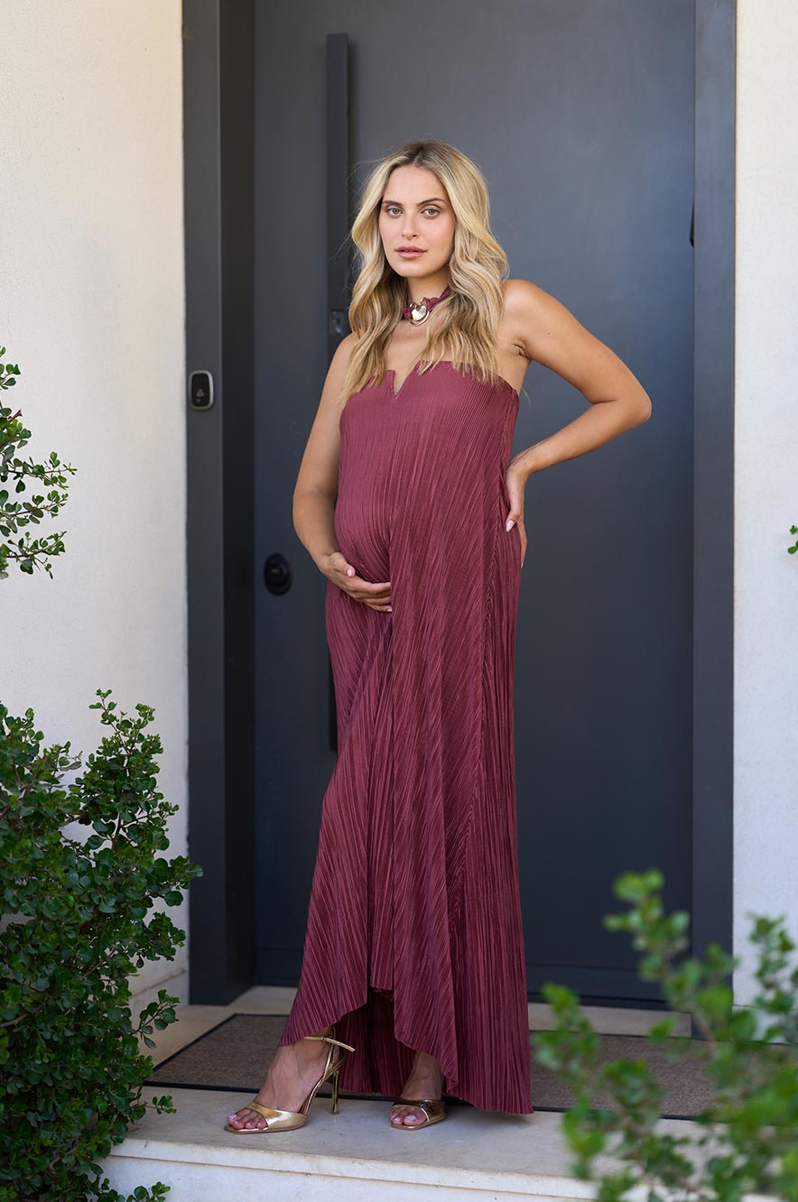 שמלת הריון סטרפלס באורך מקסי, מבד פליסה מבריק נשפך וטאץ' מיוחד - מפתח וי קטן בחזה. השמלה מגיעה עם חגורת קשירה להדגשת המותן עם קישוט זהב מיוחד. מושלמת ללוק שיסובב ראשים!