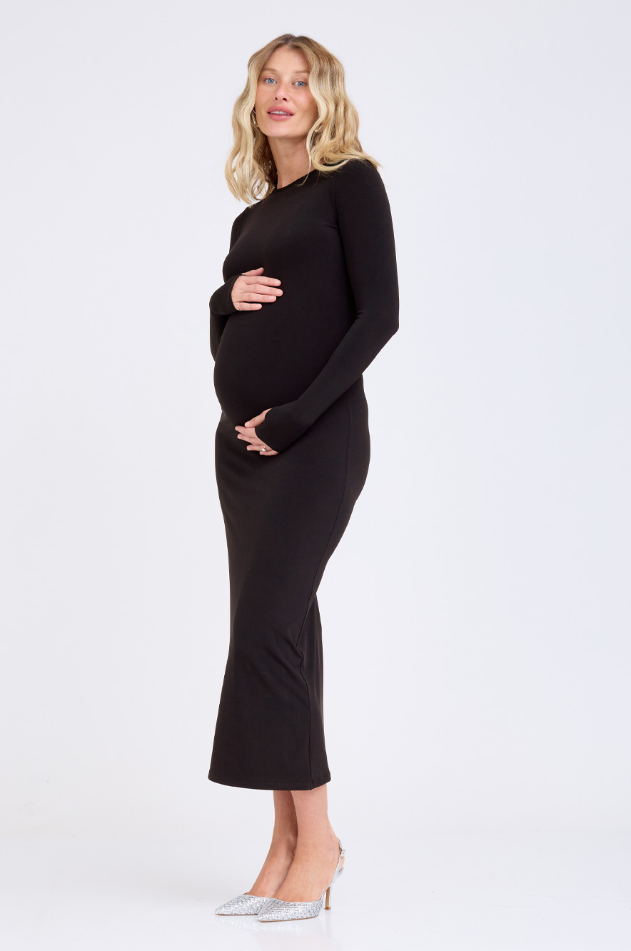 שמלת הריון בגזרת בודיקון צמודה באורך מקסי בעיצוב מחטב ומחמיא המחבק את הגוף בעדינות. בד נעים וגמיש המותאם לבטן ההריונית, בשילוב עם מחשוף ניקי ושרוולי כפפה שמוסיפים טוויסט מעניין. השמלה שאת הולכת לחרוש עליה בחורף הזה בין אם זה לבילוי בערב עם נעלי עקב או ביומיום עם סניקרס וז'קט ג'ינס.